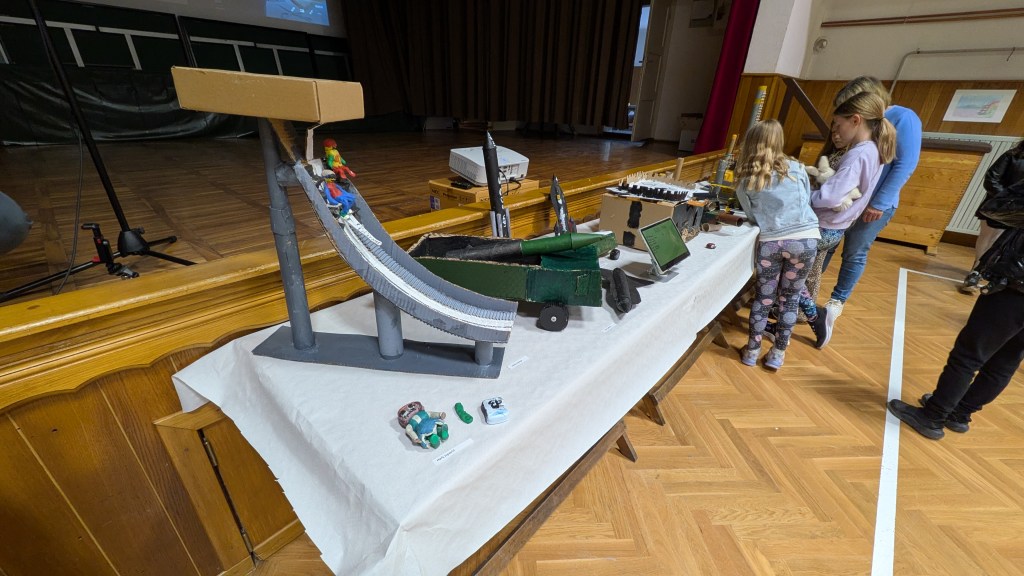 Kot že nekaj let zapored smo na razstavi opazili tudi kar nekaj 3D objektov. Poleg tovarne, raket, vojaških vozil in kuhinje smo se lotili celo planiške velikanke in na njej čisto prava Domna in Niko Prevc s Slatnarjevimi smučmi. Skakalnico je izdelal Jakob Zalokar.