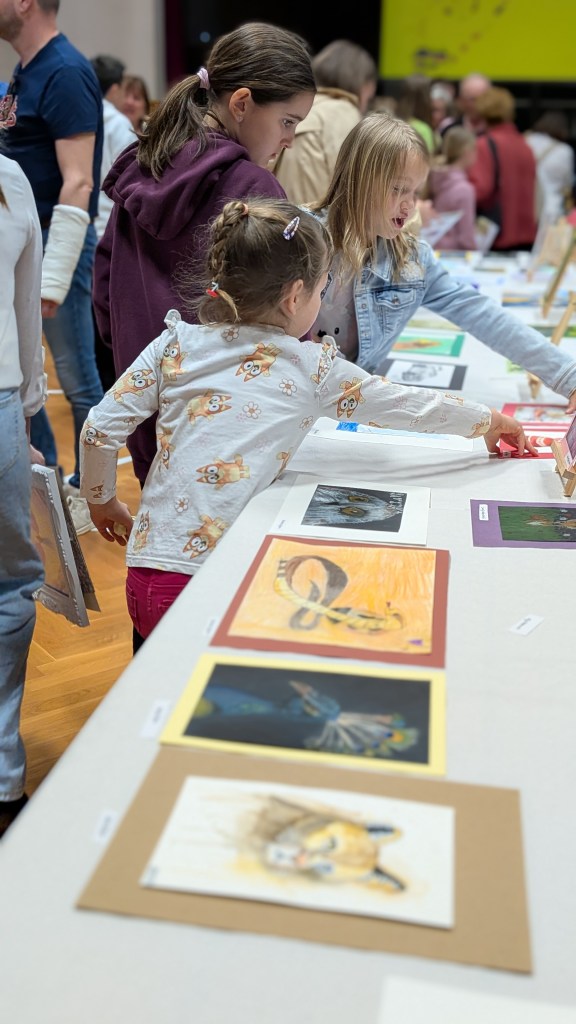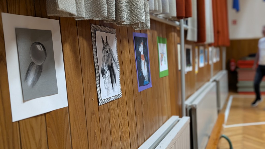 Poleg animacij pa so nastale tudi izjemne risbe in slike, ena od njih je tudi “krava”, ki nas je povabila na razstavo in je delo Benjamina Mlakarja Kržišnika. Najbolj priljubljen motiv so živali, tako realistične, kot stilizirane. Preko izbranih motivov, ki si jih otroci izberejo, se učijo konstrukcije risbe, mešanja barv in senčenja. Včasih je potrebno veliko energije in volje, da umetnino končajo, a na koncu sta sreča in ponos v očeh neprecenljiva. Na tak način si otroci dokažejo česa so sposobni in ko to pokažejo na razstavi je zadovoljstvo popolno.